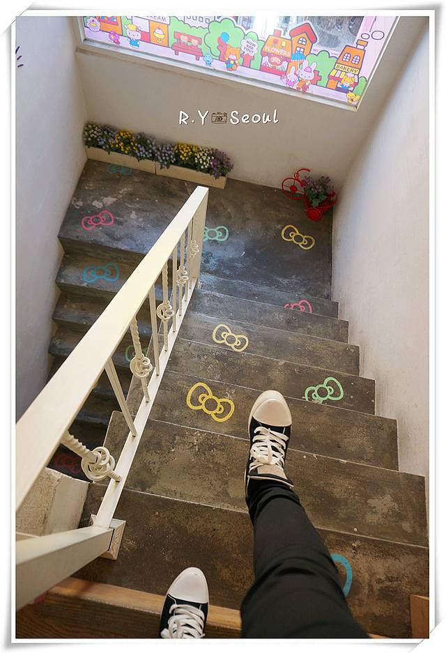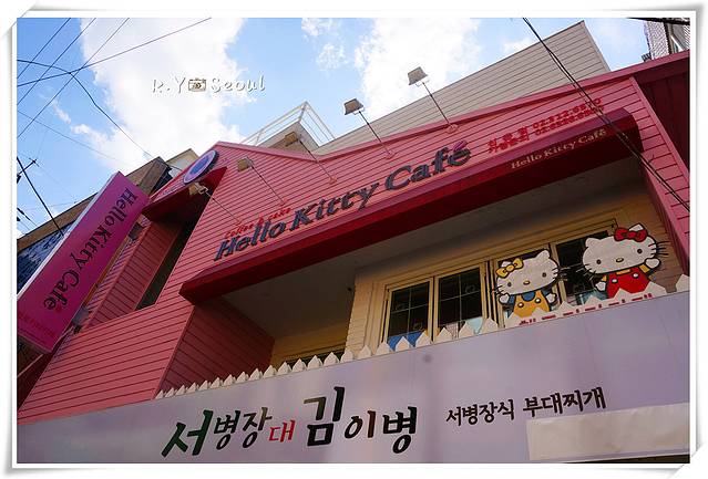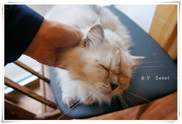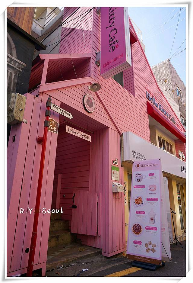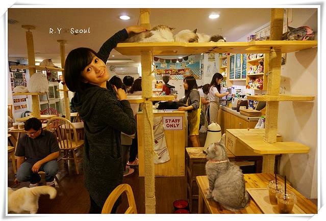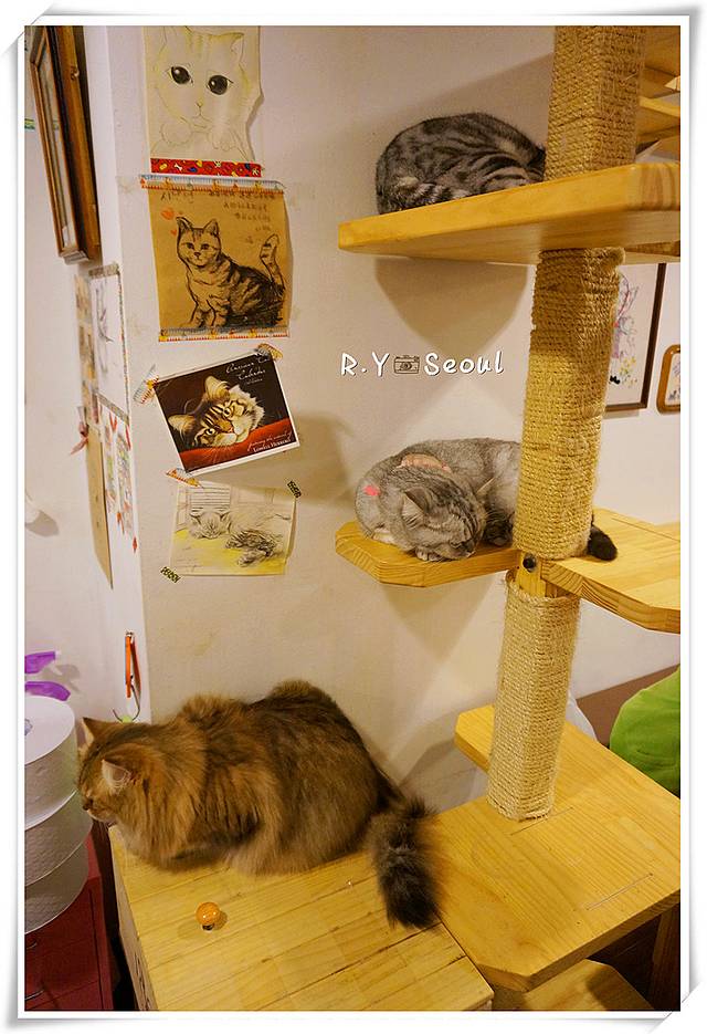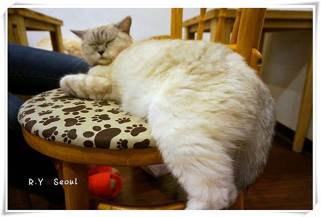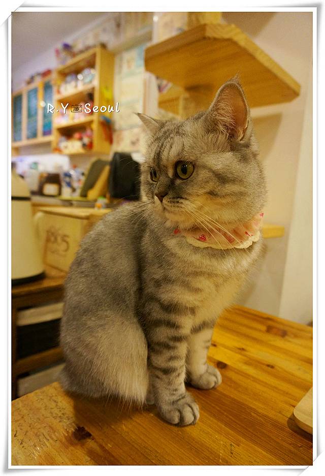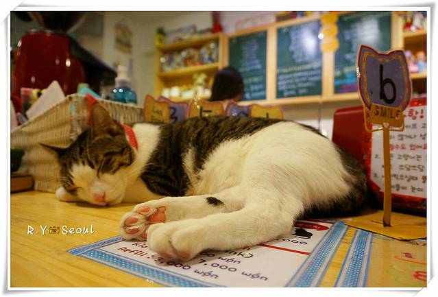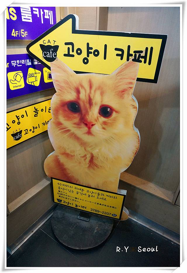 在寻找猫咪咖啡厅的过程中我又一次愚蠢地迷路了,而且更蠢的是后来才发现是因为我看错了地图……其实从明洞地铁站旁的主入口走上主街道,在第二个路口右转,再走过几个店铺就到。它位于一栋大楼的三楼,门口有醒目的标志牌。