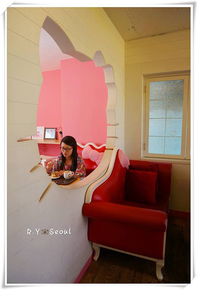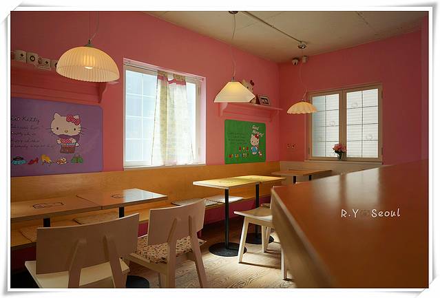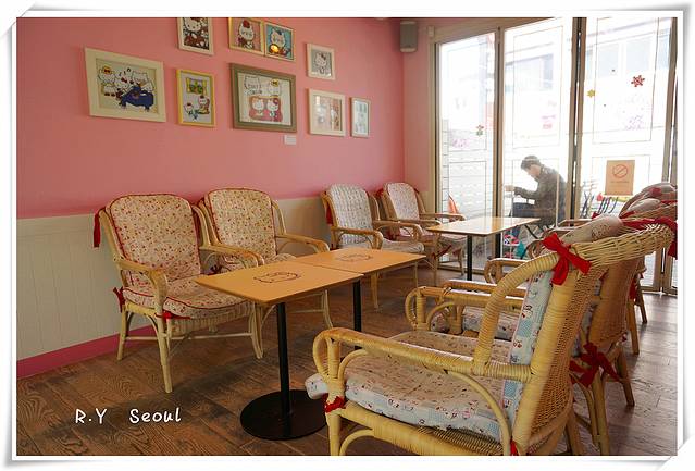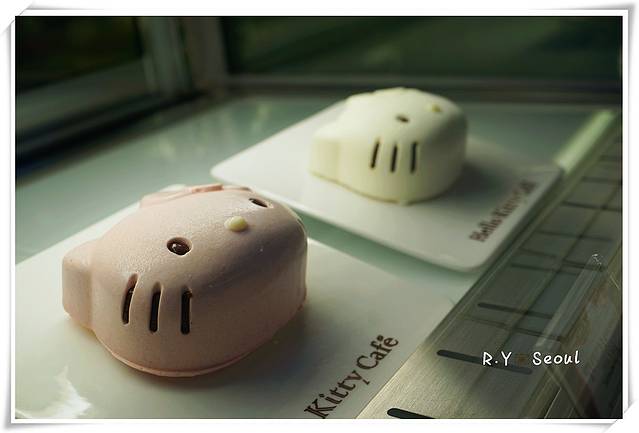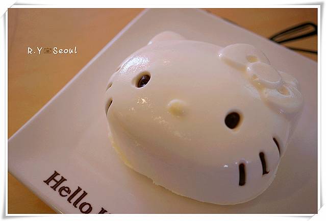 最有特色的除了Kitty拉花咖啡,应该就是这里的甜点了。不管是松饼还是芝士蛋糕,做出来的Kitty头像都非常精致。价格也不菲,松饼一枚5000韩币,蛋糕更贵要15000,折将近人民币100元了。