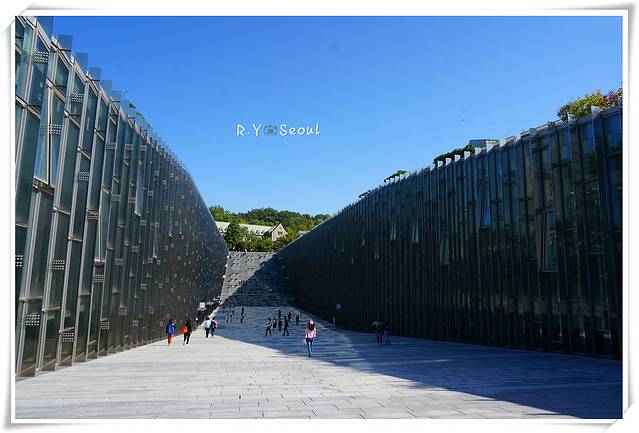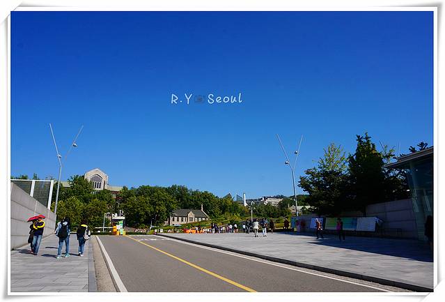 或许因为自己的大学生活太太太贫瘠,一直对美丽且充满风情的梨大校园心向往之。果然一下车就没有让我失望,远远看去一片宽阔的绿。从严格意义上来说,梨花女大是没有校门这个概念的,就像图片中看到的那样,全开放的校园没有围墙禁锢,呈现一派自由风貌。而且这天气,哇,好到让我想要感动落泪啊。