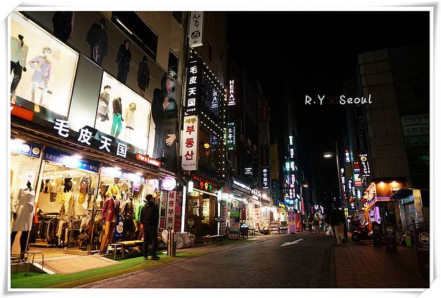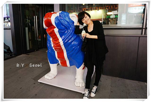 因为明洞人多面积大,行进速度受限,逛着逛着也就晚了。虽然也号称不夜城,但相比东大门,明洞的大部分店家还是会在晚上十点左右准时闭门谢客。这是某个已经关门的品牌前面的狗狗雕塑,真心好爱,求搬走!(请忽略我奔波一天后不听话的刘海儿~)