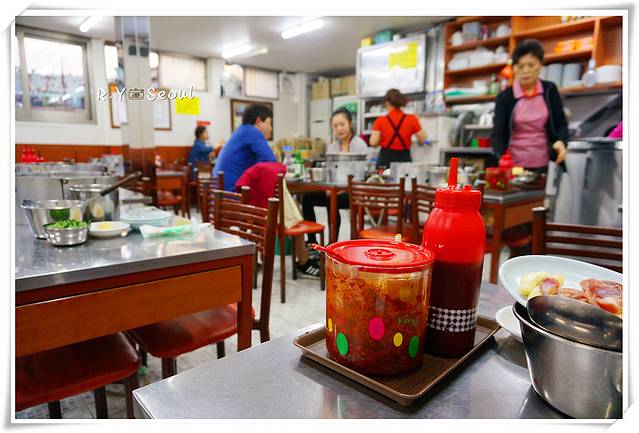 走到这才知道为什么地图上标着一只鸡胡同,因为整条街都是各种各样的“一只鸡”鸡汤店啊~任君选择。其中有几家人好多好多,还有游客在门口排队,我估计应该是“元祖一只鸡”这样有口碑的牌子吧。我俩对吃不太讲究,纯粹为了感受一下这有特色的饮食文化,所以选了另外一家没什么人的店就进了(名字没记下来,同一条街这家店有两个铺面,应该是主店和分店)。不过吃着吃着发现还真不错呢,而且慢慢地整家店都坐满了韩国本地食客,一个中国游客都没有。这表示口味地道吗?怎么有种歪打正着的feel?刚进去的时候店内是这样的,后面就满了。韩国人好像很爱吃鸡汤配烧酒,整个店堂好热闹。