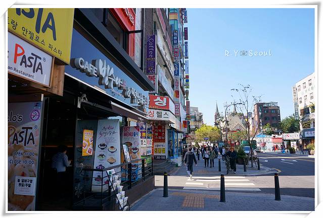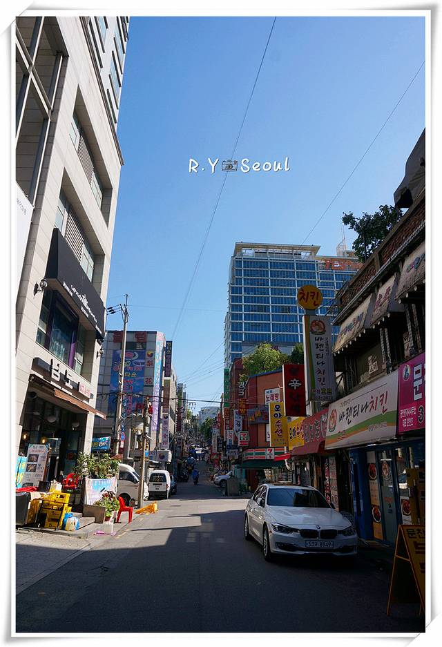 严格来说,梨花女子大学也是新村区域的一部分,但是因为个人爱好,我就把它单列出来说了。而针对我概念中的新村,第一个目标原本是Hello Kitty咖啡馆。老实说我对那只无嘴猫挺无爱的,但这种性质的卡通咖啡馆从没去过,忍不住还是想开开眼界。可人算不如天算,即使地图导航在手,我还是不负众望地迷路了,一开始没找到不说,还很憨直地越走越远。所幸整个新村片区都相当热闹,大学林立营造出年轻氛围。哪怕到现在我也没搞懂我走的是哪条道,但沿途风景足以让人心情愉快。逆着阳光来一张,是不是有种韩剧范儿?