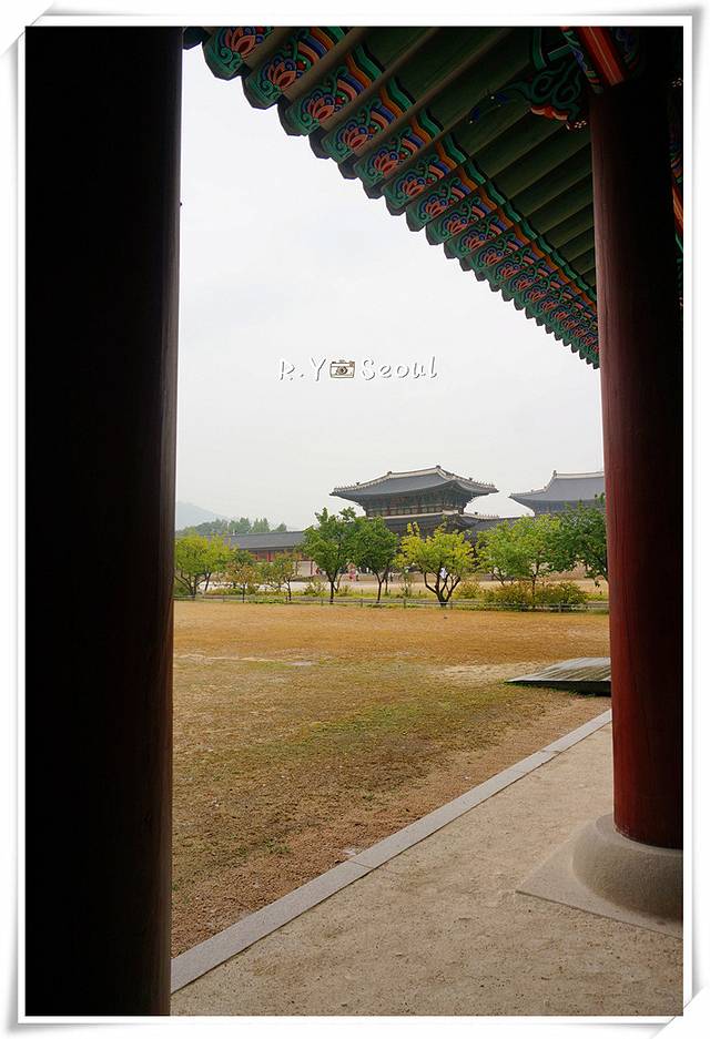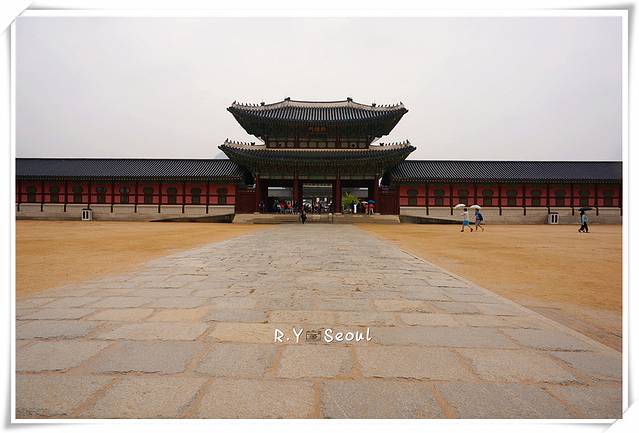 从三清洞街南端走出去,步行不超过15分钟就能到达景福宫入口。门票3千韩币一人,便宜得让我吃了一惊。不过实际走进去,会觉得这个价格太!合!理!了!和故宫这样的恢宏古建筑群不同,景福宫90%以上都是翻新的,虽然也努力营造雕梁画栋的即视感,但那种刷着新漆的浓厚山寨味还是挥之不去啊。再加上国人早就看惯了浮夸的紫禁城贵族风,对相对小规模又简朴的韩式场景只能表示无感。尤其是在暴雨倾盆的日子里,景福宫的泥沙地简直是我的噩梦。我无法理解为什么一个官宦云集的地方会有这样的地面,只能一路挽着长裙打着伞,分分钟要疯的节奏。