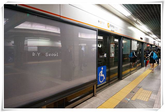 一直听说在首尔坐地铁要注意不同方向从不同入口进入,但至少在景福宫站我们没有遇到这个问题。和国内一样,同个站点的对向来车在同个站台候车,看清楚站名即可。