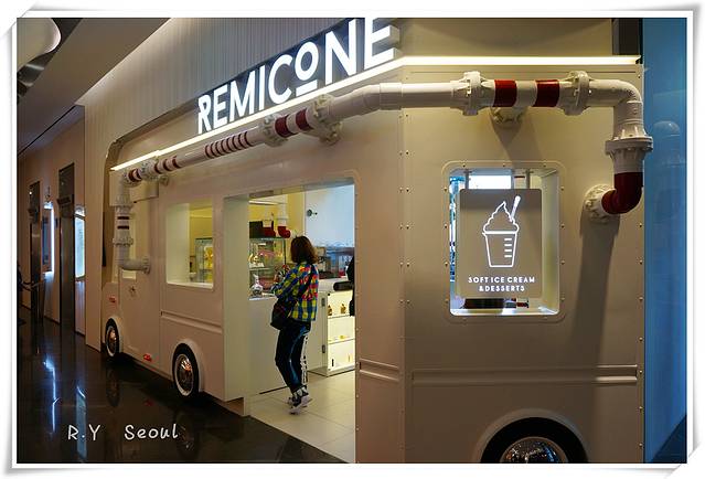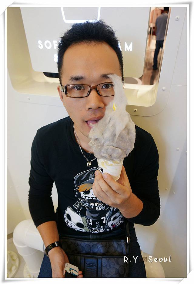 在DOOTA一楼很意外地发现了传说中的REMICONE乌云冰淇淋,就是这家!可爱的白色小货车造型,轮毂盖是我俩的大爱啊。乌云冰淇淋不算便宜,跟圣代那样规格的一小杯,要价接近2万韩币。上面是黑色棉花糖,下面是牛奶冰淇淋,还装饰有一枚黄色闪电状的巧克力。购买常常是排队的,叫号取餐。拿到手要赞一下,乌云效果杠杠的,配着黑色桌面好合适,山雨欲来feel有没有。