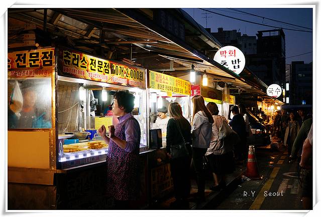 离开清溪川,认认真真开始寻找一只鸡(哪里怪怪的……)。如果你同我一样沿着溪边走下去的话,到第一个阶梯上回到路边,右转过马路走进去,会看到一片餐饮夜市。唉,其实我挺想在这儿吃的,年糕鱿鱼神马的看起来好美味哦~(被拖走)