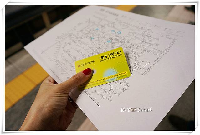 杀出景福宫我有点蒙,光化门前车水马龙大堵特堵,几乎看不到拦下出租车的可能性。而且雨势已经大到令人发指的程度,我从头发到衣服到裙子到鞋,没有一处不彻底湿透。这种特殊时候提前做攻略的PLAN B就派上用场了,果断从门口右转,步行约500米,跨一个街口就杀到地铁站。兔子先生再不喜欢交通工具,在这种特殊时刻也只能乖乖听话啦哈哈。首尔的地铁很干净,也许是时间段的关系,景福宫站的人相对少,而且服务好周到。我刚在自动售票机前站定开始研究,就有一位穿着红色制服的阿姨(其实可以算是老太太了)询问我要去哪里,而且用的是流利的英文!知道去明洞站之后,她以迅雷不及掩耳的速度在触摸屏上一阵狂点,指导我放入纸钞,两张一次性地铁票就顺利入袋,而我还在眼花缭乱中……离开前阿姨还热心地指点我该从哪个入口进入走哪边上车,感动得无以复加。事先打印了地铁线路图,在热心的阿姨面前全然无用武之地啊。首尔的单程地铁票长这样~