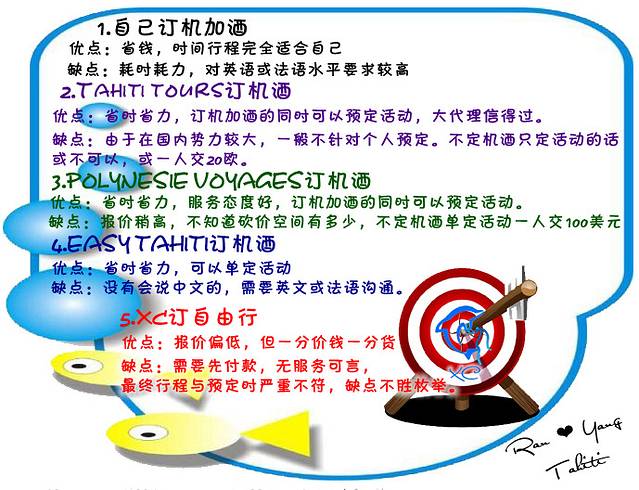 大溪地大多数是自由行,即使找代理定也是没有导游的自由行比较多。通过几个月时间看网上关于大溪地的游记,了解到大溪地三个较大的代理,一个是Tahiti tours(大溪地旅游集团),一个是POLYNESIE VOYAGES(波利尼西亚旅游公司),一个是EASY TAHITI。其中第一个Tahiti tours在国内势力最大,XC,X旅,X青旅等等都是靠这个代理开展大溪地旅游业务的。除去代理也可以自己找特价机酒订行程,这样下来会比找代理价格低很多,但是需要自己英语水平过关,最起码能跟酒店的人发邮件往来。我的行程最终选择的是XC,因为当时看到XC的一条线路感觉相对来说较便宜,而且之前总在XC订机酒自由行,感觉很信赖它。毕竟这次旅行价格不菲不敢轻易找没试过的代理订。但最终结果告诉我,选择XC就是我此行最失败的地方,没有之一。