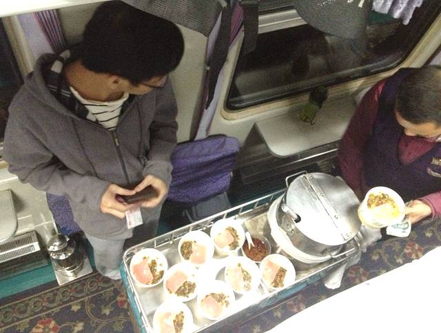 在火车上,有提供宵夜的米线,还很多人买的!其实坐一晚通宵的火车,觉得挺有趣的~