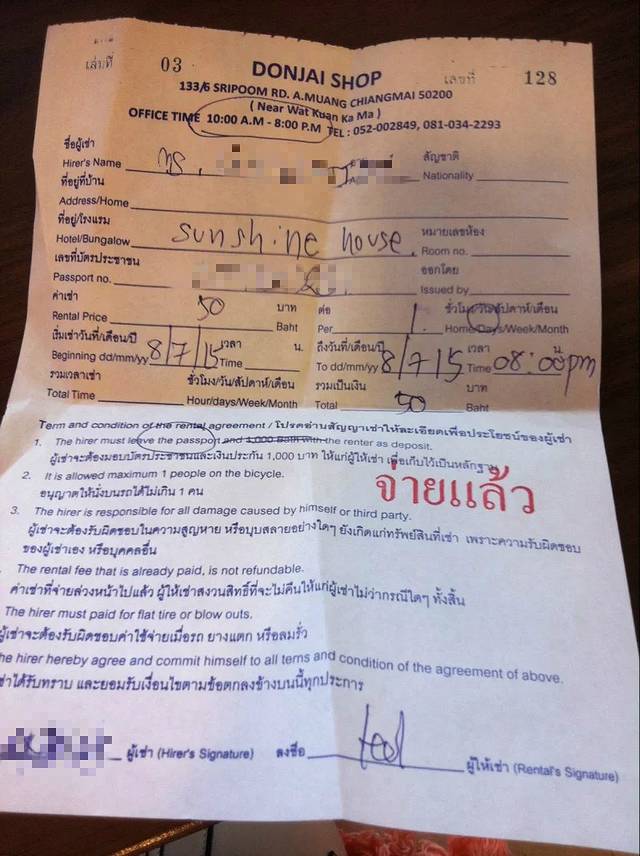 租了一辆单车,因为泰国是靠左边行驶,而且清迈的信号灯并不明显,车辆也比较多,单行道也比较多,怕丢和怕撞车的情况下,我选择了租单车。50B一天,在古城内骑单车很舒服,一点也不累。租单车需要押护照。