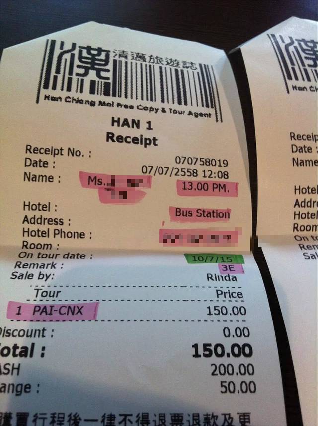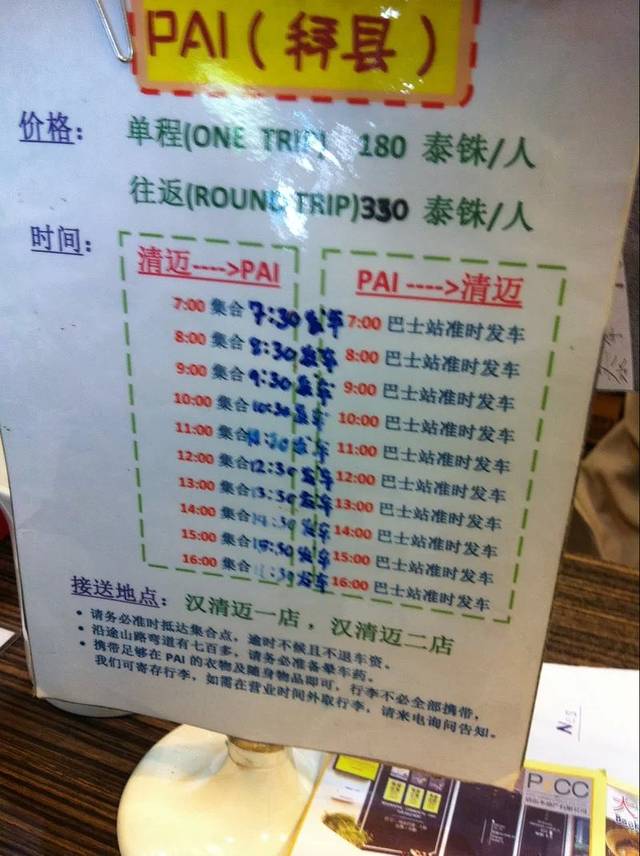 在汉清迈订的去拜县的票,订了两张,来回各一张,去程180B,回城150B,不包酒店接送。