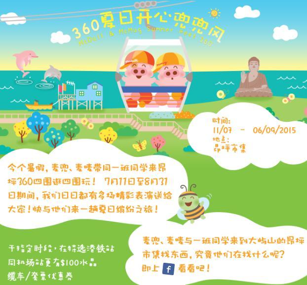 我们去的时间是六月底,当时没想到昂坪在暑假会有活动,真是刚好就跟活动擦肩而过了!来到这边才看到他们家的节目预告。原来在7月11日的时候就开始举办他们的暑假活动,是以陪伴大家度过童年的麦兜为主题的“360夏日开心兜兜风”,说是麦兜从小在大屿山长大,这个暑假正是寻根之旅呢。听起来就好有趣,这个活动在7至8都一直开展,近期想去的朋友们千万不能错过啦。每天还有麦兜拉拉舞表演和各种麦兜元素的陈列,可以去感受一个欢乐的暑假!