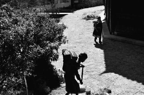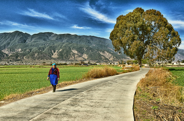 远处一位大妈向我们走来,中午了,应该是赶回家吃饭的。人生的宽度。若不是旅行,怎会看到此情此景。我,老人,树,山,宇宙...