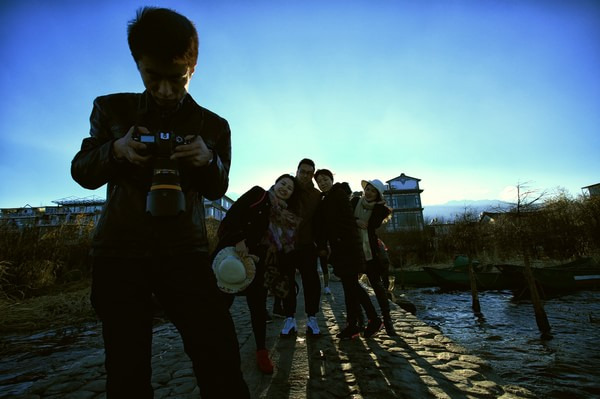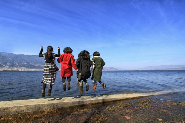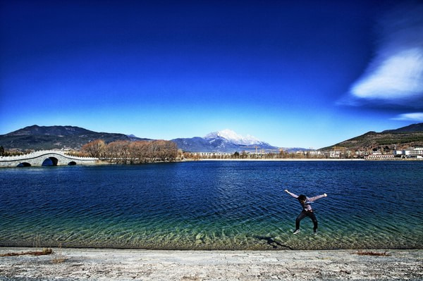 我们正在一个小码头合影留念的时候,这只牧羊犬好像每天都会光顾这里一样,在水里玩耍嬉戏,它冲进洱海的时候吸引了我们所有人的目光,被溅起来的水花被凝固住,好像时间就停止了一样。