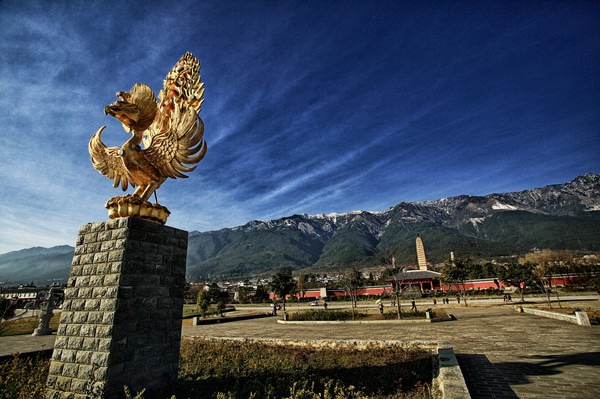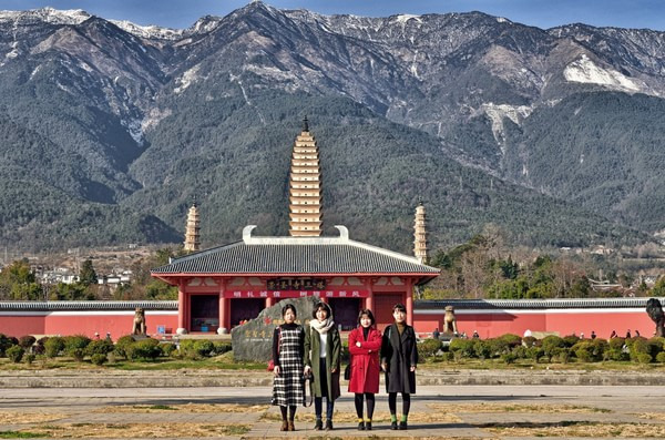 【崇圣寺三塔】 ? ?沿着214国道向北行驶,过了大理古城,就是著名的崇圣寺三塔了。它是南诏国和大理国时期建筑的一组颇具规模的佛教寺庙。门票121元,将大理三塔公园和三塔倒影公园联票销售。因为三塔公园的门票太贵,且都是游人,凡是收费的热门景点,都是我所不喜欢去的地方,所以没有买票进去三塔寺参观,在外面与同车的四位福建女孩拍了旅游照便离开了。大理三塔、具有“佛都”之称的崇圣寺,为大理这个人杰地灵的妙香佛国增添了一份庄严。如果你对里面的建筑以及南诏国情怀的话,还是建议花半天时间到里面去看看的。