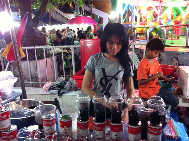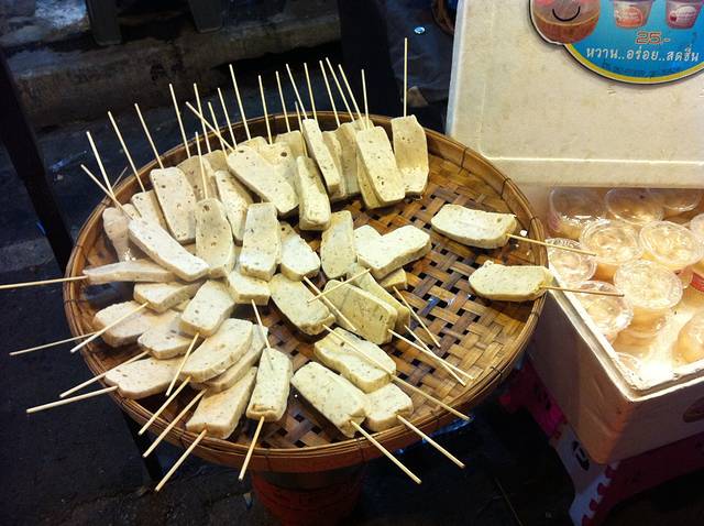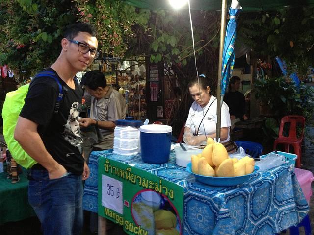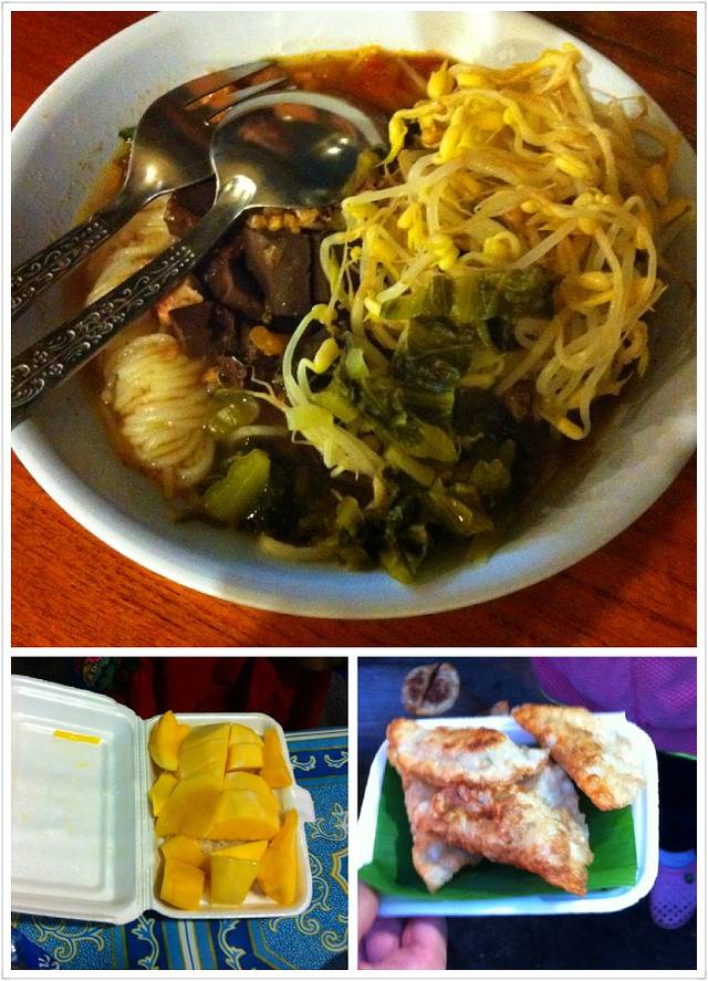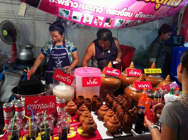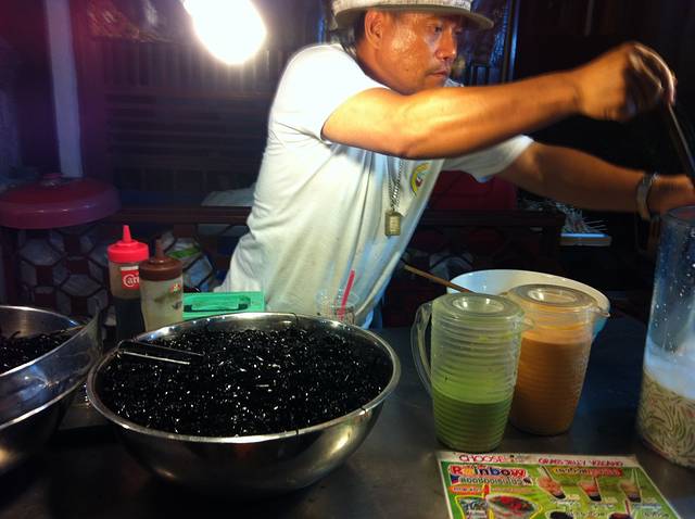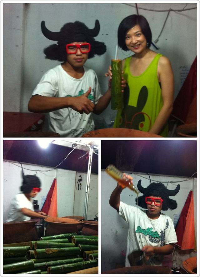 泰国的夜市是我的挚爱,在泰国似乎任何地方都有夜市,而且品质都不差。在Pai县的街边天色一暗就冒出了很多小吃摊档,煎饺、芒果糯米饭、酸辣粉吃的不亦乐乎!酸辣粉实在太辣了,必须要喝杯冰的饮料才能恢复知觉。卖冰茶的小哥打扮好有趣,这么热的天看到他带着那么厚的帽子,也要捧个场啊!用竹筒装的冰茉莉茶,一饮而尽,口唇的知觉也随之恢复。