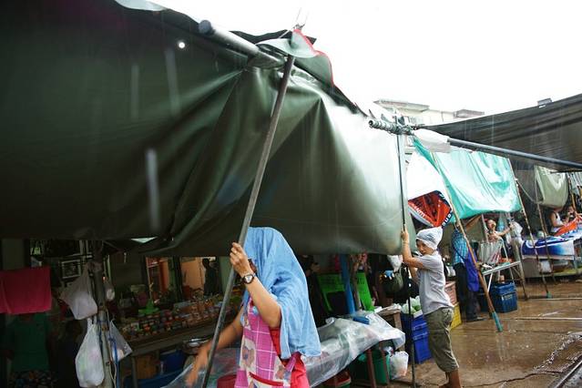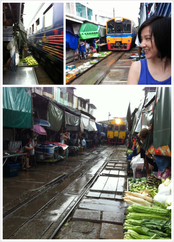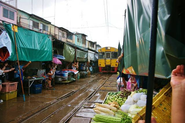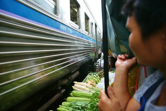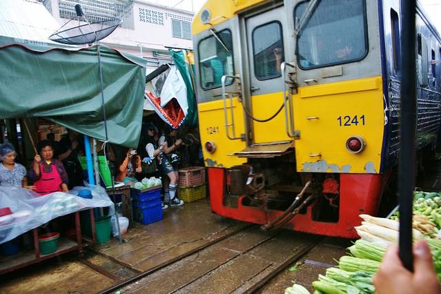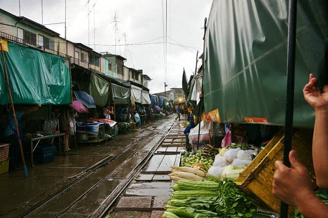 火 车终于来了,铃声响起,人们就开始收摊了。这才发现,每个摊位的货架下面装着轮子,地上有轨道,他们只需要把货架拉回来就行了,火车一走向前一推,很方 便,难怪可以那么快收摊。货架上一般都有防雨、防晒的顶棚,是用竹竿撑起来的,摊主之间会互相帮忙去收起遮阳棚。同时,摊主们还负责警示游人,如果有不知 深浅的游客走到铁道中间去,他们会很紧张的叫那人回来,还会主动让地方给游人站。我顾着拍照,在火车快到的时候冲出去拍了一张照片,搞到周围的摊主一阵惊 呼,看到他们担心的表情真心觉得泰国人好善良。