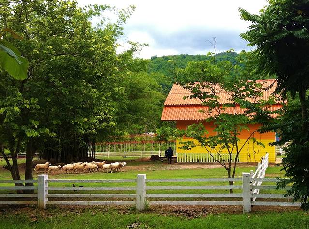 虽 然在荒郊野外,沿路却有不少的餐厅,装扮的很有情调,我们在一个漂亮的餐厅吃了个丰盛的午餐,环境、味道都是一流。在国内也去过一些地方自驾,沿途吃饭的 地方真是不敢恭维,还是泰国人有情调啊!有情调的不仅是餐厅,连羊圈都搞得很小清新。我们吃饭的餐厅旁边有一个黄色的小木屋,那居然是羊圈,我们其实就是 先被这黄色的小木屋吸引停下来,才发现旁边的餐厅的。相信住在小木屋里的小羊们会很愉快吧,感觉在泰国连羊的幸福指数都要高一些。