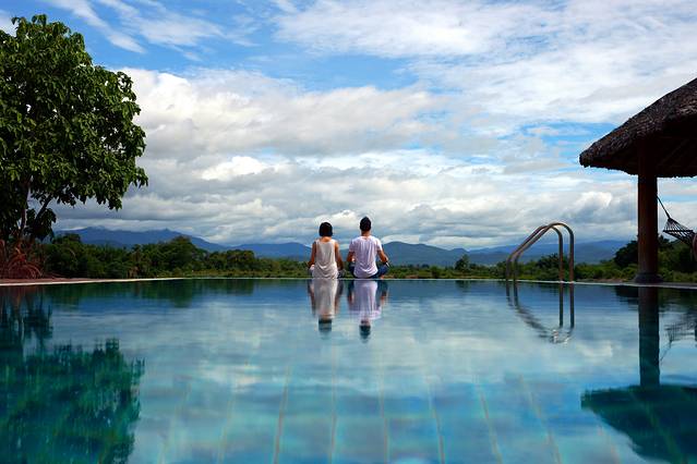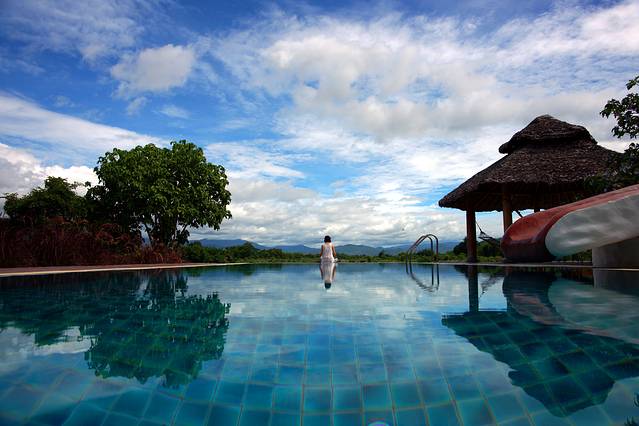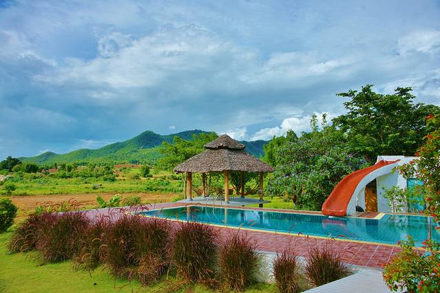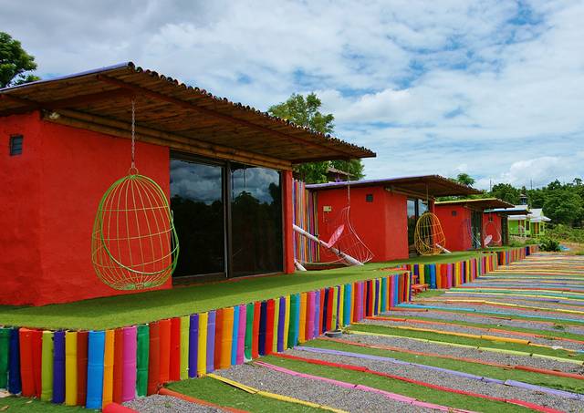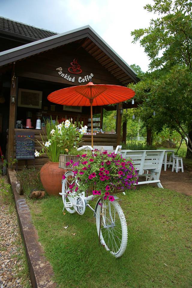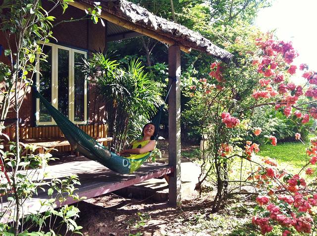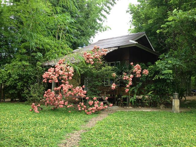 经过二战桥和草莓园就来到了我们住的孔敬酒店(kuad khonthoe Pai cottage),酒店建在山间的一片开阔地上,只有7间房,都是独栋的别墅,我们就住在一间鲜花丛中的小木屋里,躺在门口的吊床上看着满眼的花花草草,真想在这里住上一辈子。这么棒的酒店才140元人民币一晚,实在实在是太太太超值了!