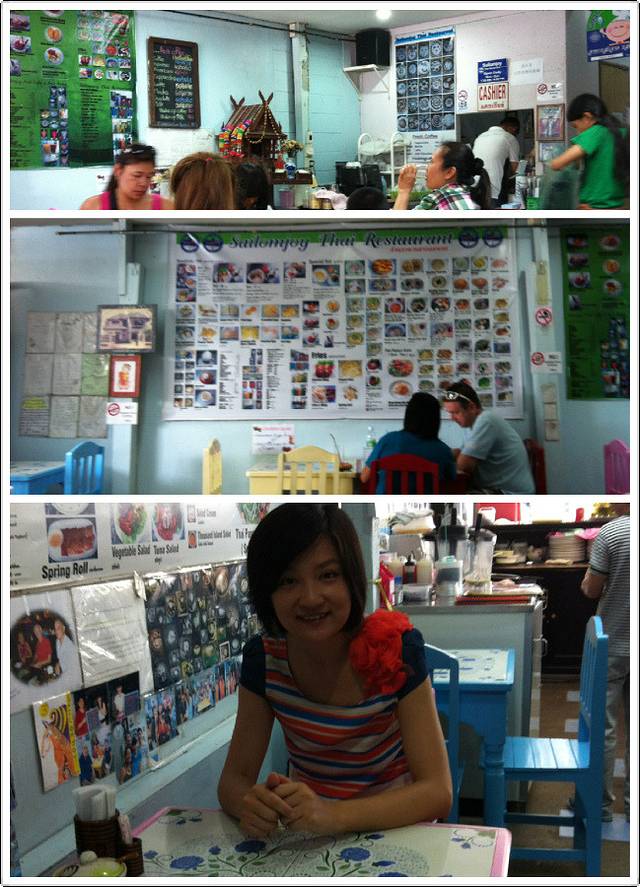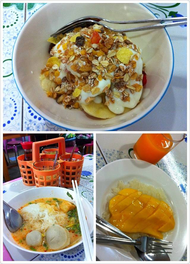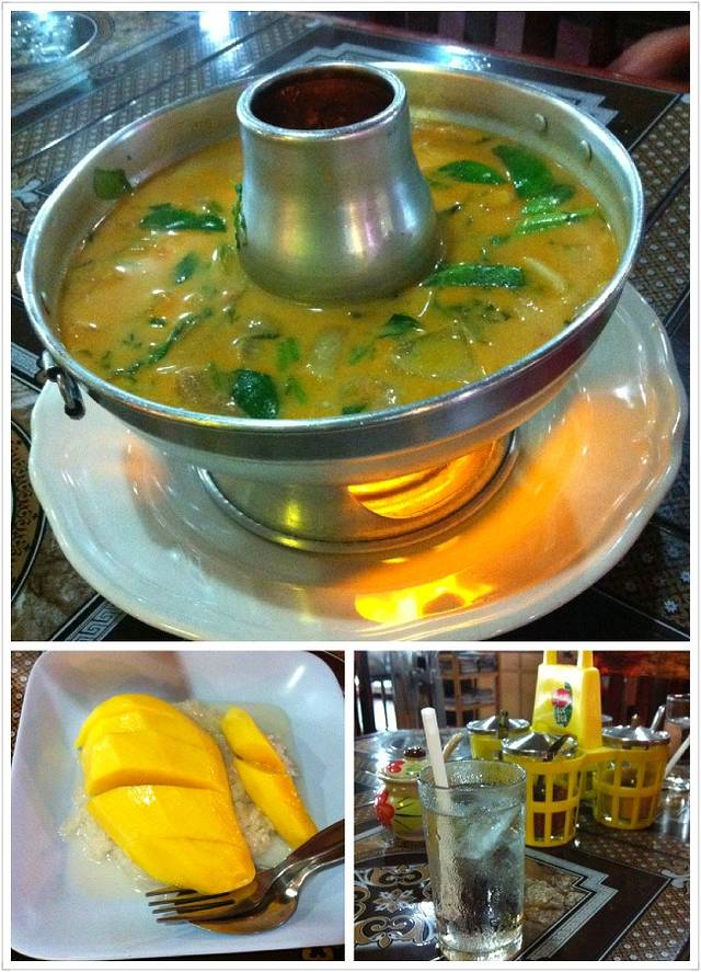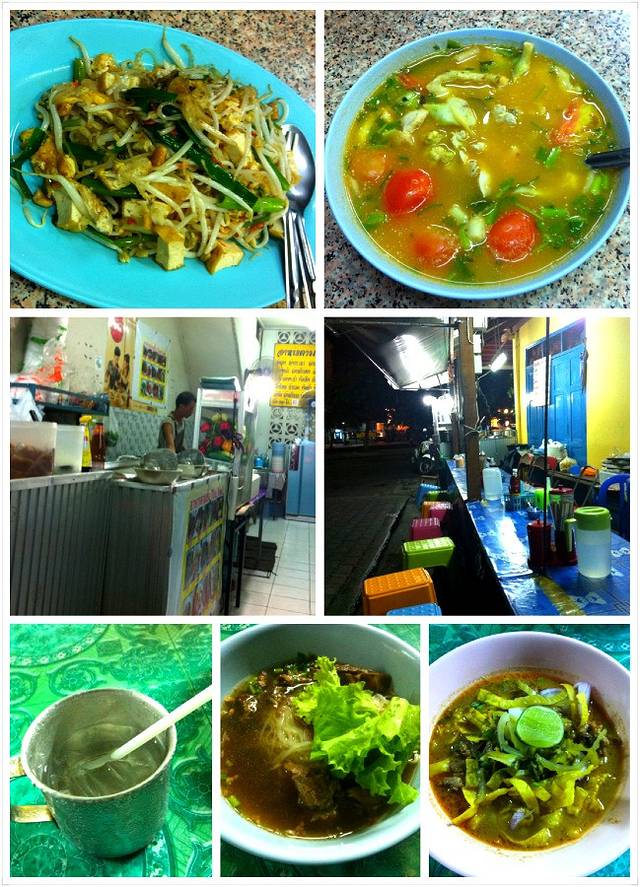 冒雨开了半个 多小时到达普吉镇,没有什么特别之处,也可能是下雨的缘故,无心在街上看风景,找了一个很多当地人的小店吃午餐。这个餐厅相当简陋,没有餐牌,只有墙上贴 了一张纸,上面全是泰文,看不懂。于是,看到别人吃什么,就指着说要这个要那个,看到每桌都有一份油炸的东西,就也要了一份,想不到是非常好吃的炸鱼块, 难怪每桌都有啊!我们进了这个店,有点被当成“外国人”的感觉了,别人看到我们都很好奇,大概这个小食店是本地人才会去的吧。招牌我也找不到在哪里,因为 也是瞎逛去到的,根本也不知道在什么路上,下次去也一定找不到这店了。但这店的东西真心好吃,价格也是非常便宜。