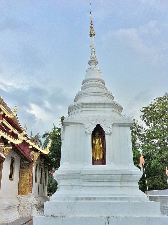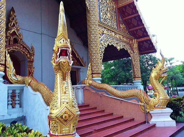 今天的主题就是清迈的寺庙啦!泰国是个佛教国家,寺庙随处可见。因为中午十一点半要还车,我们一大早起来赶着去了一趟双龙寺。双龙寺在著名的素贴山上,可以看到清迈全景,距离我们住的塔佩门大约1小时车程。到达双龙寺要爬上一个很高的台阶,台阶两边的扶手是两条金龙,双龙寺也是因此而得名。寺内有一座释迦摩尼佛舍利子的佛塔,因此每年都会有世界各地的信徒来到这个寺朝拜,这也是我们一定要来的原因。进去寺庙都要脱鞋,有些洗手间也要换专用的拖鞋,这点有些不适应。