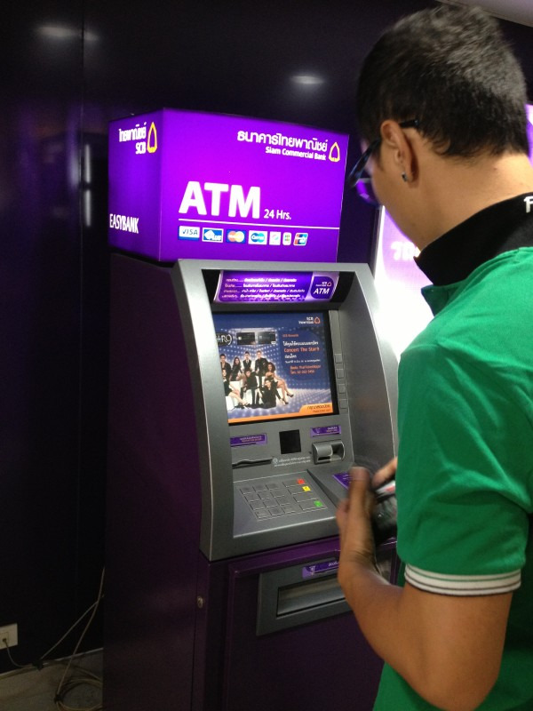 在国内准备一张银联储蓄卡,无需在国内换钱,拿着卡在泰国机场的ATM机就能取泰铢,听说比在国内的银行兑换汇率更好。看网上介绍说紫色的ATM机是汇率最好的,我们取了20000泰铢,扣了人民币4054.78元,手续费52.55元,查询余额一次4元手续费。泰国的手续费是按每笔来收取的,所以估计好在泰国的花费,一次取够可以节省手续费。