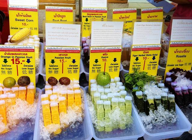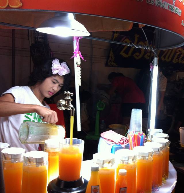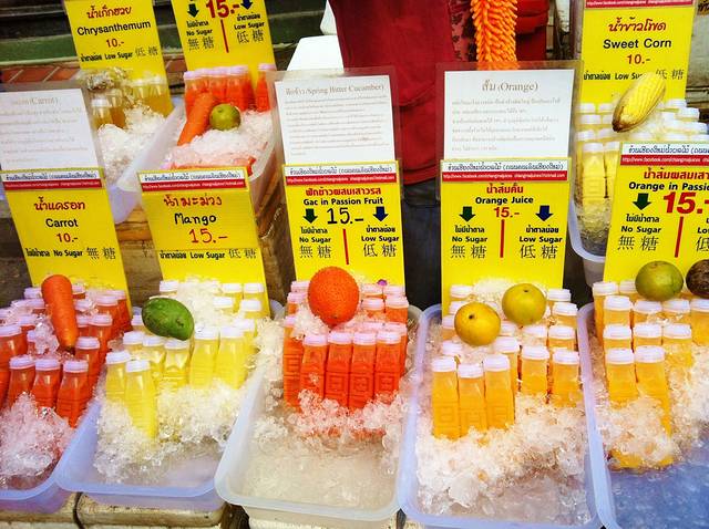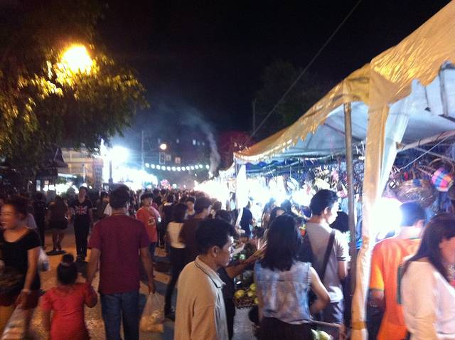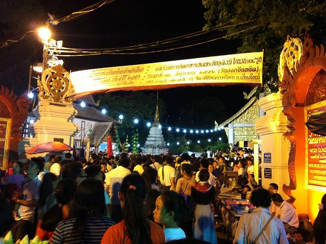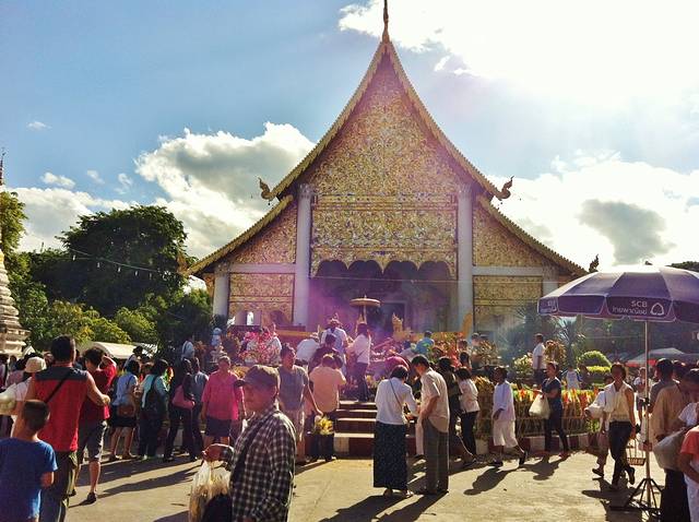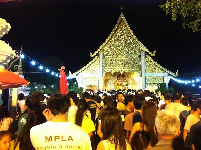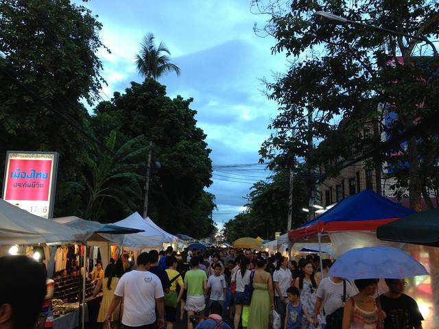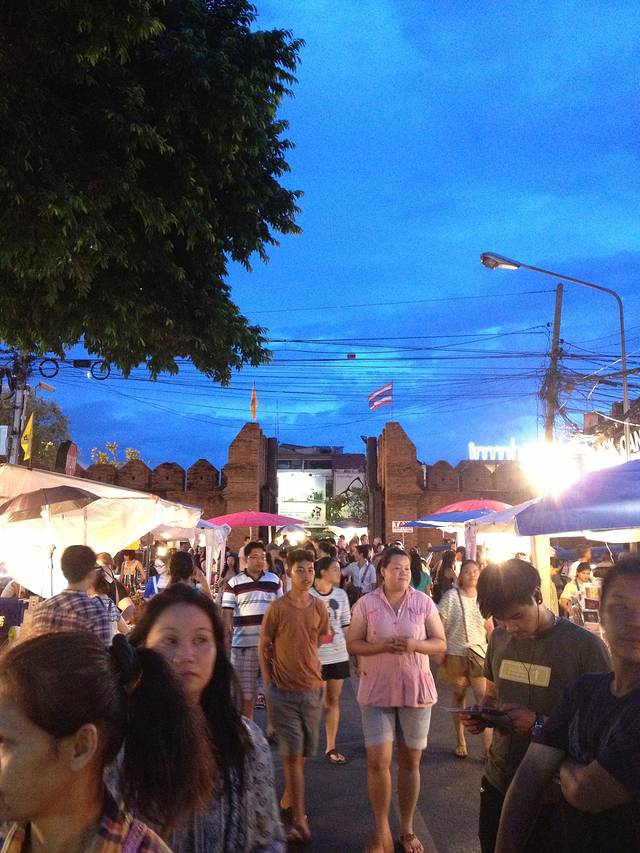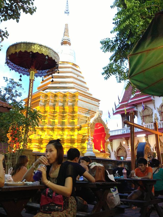 傍晚时分回到清迈。今天是周六,看攻略介绍有周六夜市,我们朝着人多的地方去,相信那里一定是周六夜市的所在。果然不出我们所料,街边的小吃摊档密集起来, 我们发现已经来到了契迪龙寺。而汹涌的人潮并不是来夜市吃东西的,而是手捧鲜花去寺庙的,想必今天是一个很重要的佛教节日。想起早晨吃早晨的店里,也看到 几个人在店里拼了两张长台在扎鲜花。契迪龙寺被人群挤的水泄不通,我们也进不去也不懂宗教礼仪,所以就专心在夜市吃了起来。一圈一圈的那种香肠,里面灌的 是糯米,特别好吃。还有那个漂亮的果汁妹(正在倒橙汁,头戴蝴蝶结的那个),其实是个十足的大帅哥。吃了八九样小吃,三几样饮品之后,我还是找了一家能坐 下来的店吃了今天的冬阴功。泰国啊泰国!你要把我的胃撑到多大啊!