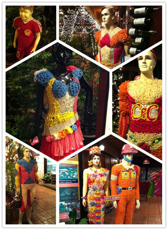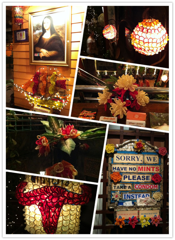 但是看了那个 名字,知道就是这家了。在网上也看到介绍说餐厅环境很好,很多绿化,感觉也很温和。走进去没几步,各种安全套装扮的人物、灯具、海报等就跃然眼前,领位的 服务员也热情的招呼我们。餐厅非常满,因为没有提前预定,我们只能听从安排,虽然坐的位置景观不是最好的,但还算运气好,一来到就有位置不用等。