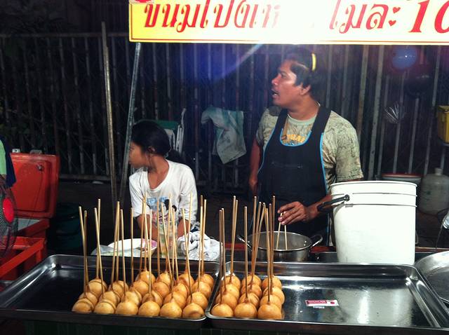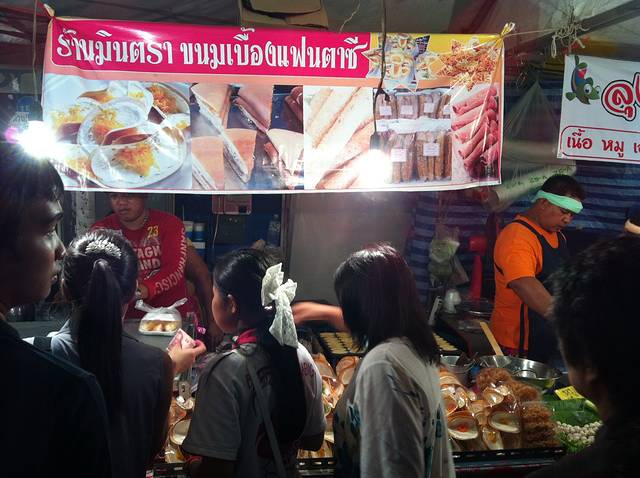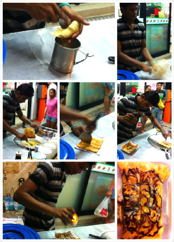 看完表演回到 我们住处附近,在一家香港餐馆吃了个宵夜,散步回酒店的路上偶遇了一位牛掰的“香蕉哥”。这兄弟当时正在做香蕉饼,香蕉饼我在普吉岛的时候曾经吃过,味道 不错,但是吸引我的不是香蕉饼,而是他纯属的技艺,动作迅速而准确到位,并且一心几用。他手拿香蕉,直接在手里就切成片了,切的时候眼睛并没有看着,全靠 感觉。然后一个手给做好的饼挤巧克力,一个手翻转另一个正在烤的饼。更牛的是,炼乳用完了,他直接用手掌拍钉子给炼乳的金属盖子上扎了几个洞出来,这样倒 出来的炼乳就是一排细细的炼乳丝。关键是用手拍钉子给金属扎洞,这是气功吧!