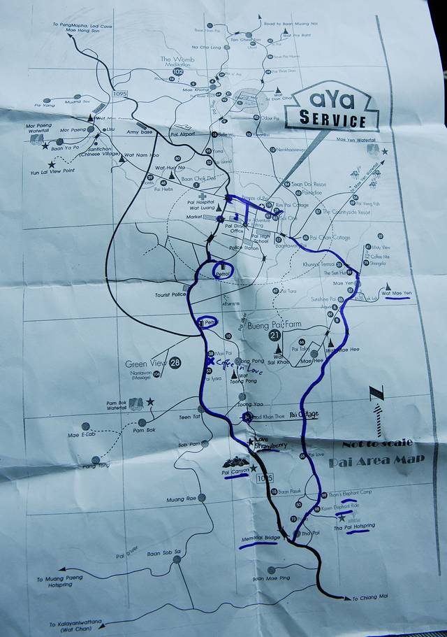 老板娘给了我们两张地图,是Pai的旅游图和商业中心的旅游图,还标出了好吃的餐厅,告诉我们各个餐厅的特色和费用情况。在这两张地图的指引下,我们顺利在Pai吃喝玩乐,真的感谢热情周到的泰国人!