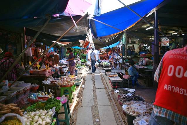 美攻铁路两旁是美攻铁路市场,卖肉、买菜、卖鱼的比较多,就是当地居民日常买菜的一个市场。它的出名是因为市场的中间有一条铁路穿过,每天有两趟火车穿梭其间,每当火车来到,铁道边的小贩就会迅速将棚子和货架收起,蔚为壮观。