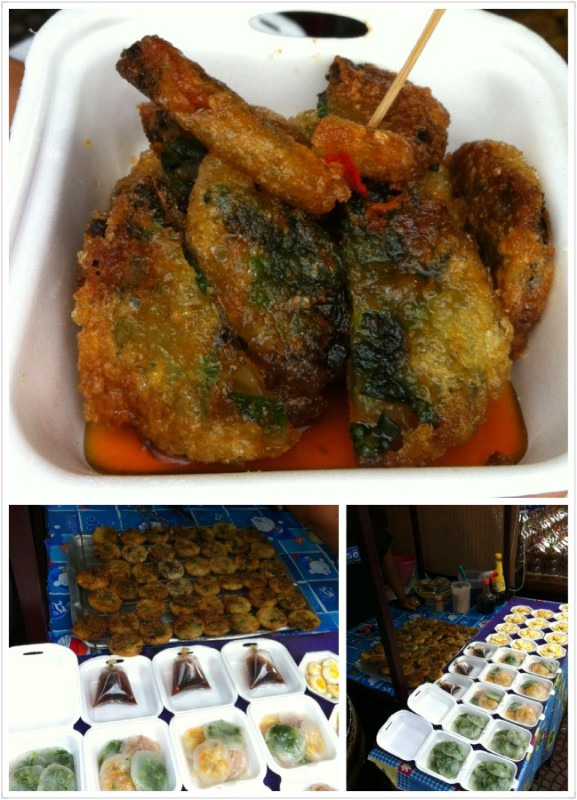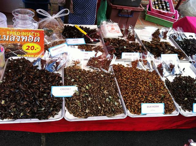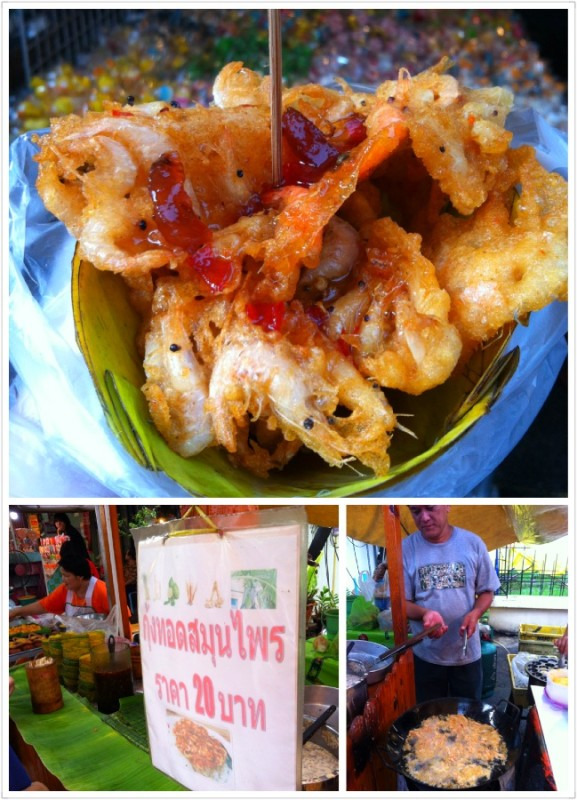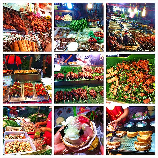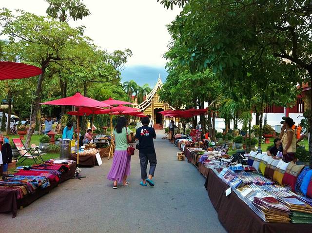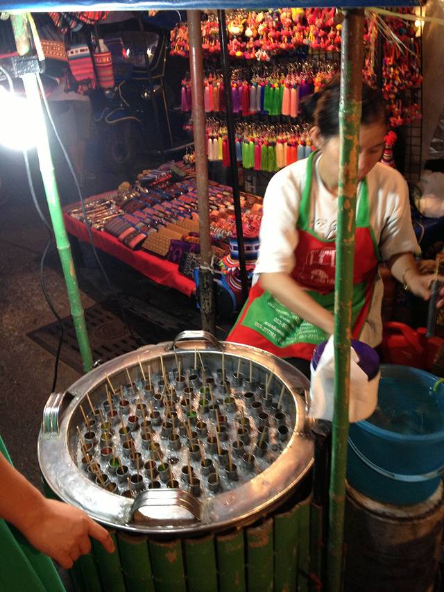 清迈最大规模的市集是周末夜市,就是正对塔佩门这条街,我们正好赶上,并且就在我们住的酒店这条街。下午三点多睡醒出来就发现已经开始封路摆摊了,这条街除了两个最大的寺庙,小寺 庙粗略估计能有五个以上,每个寺庙里面都摆满了摊档。寺庙里的摊档以小吃为主,外面街上的摊档就什么都有:衣服、食品、工艺品、鞋、包、抱枕,还有各种卖 艺的人。我只对吃有兴趣,每个卖吃的摊档都去看看,没吃过的就去尝尝,可是有一档炸虫虫,从没见过,但真不敢试!