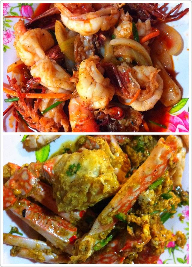 是的!就是要美美的吃,才不虚此行,到泰国就是要放开了吃。江西冷的侧门出去过一条马路就是海鲜水果批发市场,白天的时候可以在市场买了海鲜在旁边的加工店加工,晚上可以直接在夜市的摊档上选海鲜加工来吃。我们先在夜市逛了一圈,吃了8样各色小吃,才坐下来吃海鲜。海鲜很新鲜,我们要了咖喱炒蟹和辣椒炒虾。虾有一个男人的手那么大,要了3只才400泰铢;蟹的背比人的手掌还大,要了2只也是400泰铢。刚才的8样小吃加起来才180泰铢。这晚总共胡吃海喝了1000泰铢,也只有200人民币,便宜到我不敢相信。泰国真是吃货的天堂啊!