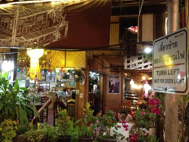 晚上我们决定去一下安全套餐厅(Cabbages and Condoms), 穷游网的旅游攻略有介绍这个餐厅,并且有餐厅的地图定位,于是,就按穷游的定位去去找。结果走了一条街都没看到这个餐厅,甚至这条街连餐厅都没有,只有一 个酒店。并且,走了一半就开始下暴雨,我们只好在酒店躲雨,等雨小点才继续找。后来开了苹果手机自带的地图找,竟然有这个餐厅的位置,不过有两个坐标,都 在另外一条街——12巷。沿着12巷往里走不远就到了地图上的第一个坐标,没有看到餐厅,继续走了十几米就到了第二个坐标,餐厅就在右手边,门口的灯光有些昏暗,完全看不出是个餐厅。