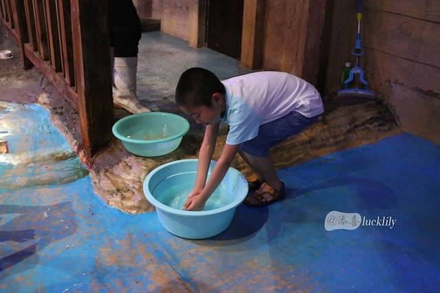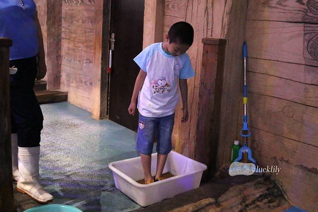 当然,为了保护海洋动物的安全,我们接近海洋动物之前要进行消毒,小朋友先是踩在消毒垫上对鞋子进消毒。