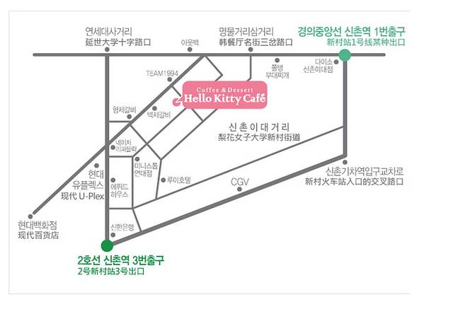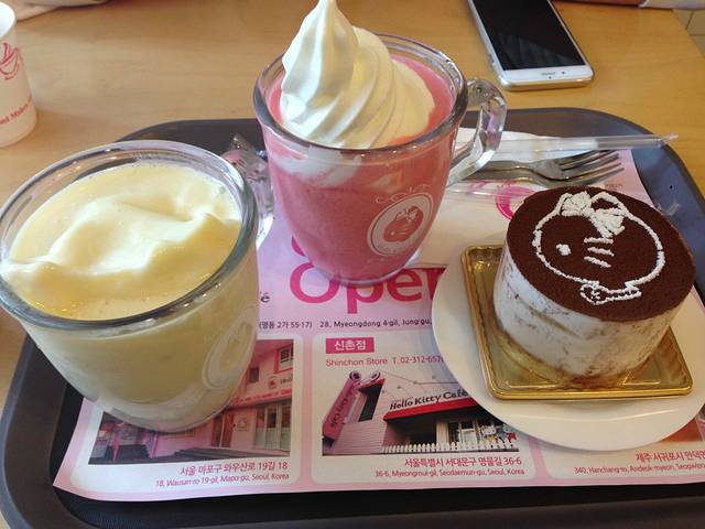 作为一名称职的“中国好地陪”,我也好好做了一番功课,其实hello kitty咖啡馆在韩国有好几家,就连仁川机场里都有一个分部,所以大家大可不必“特意前往”,明洞、新村、宏大、济州岛,总有一个是旅游的必经之地吧?!而且各处装潢各有特色,去哪一家都是蛮值得的!