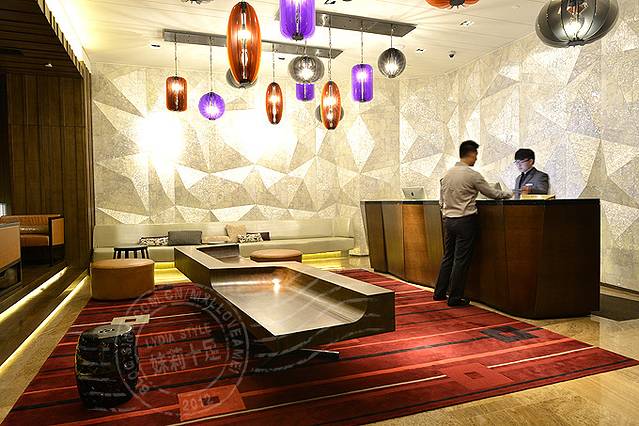 大堂的吊灯,造型别致有设计感,颜色多彩却并不过于饱和夺目,更好的协调吊灯跟大厅里的中式元素融为一体。后面的多面体墙面是真正的大理石,并不是简单做出的造型的装饰墙。