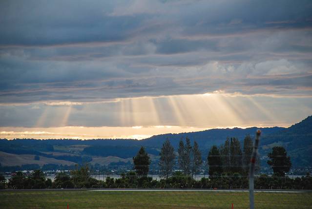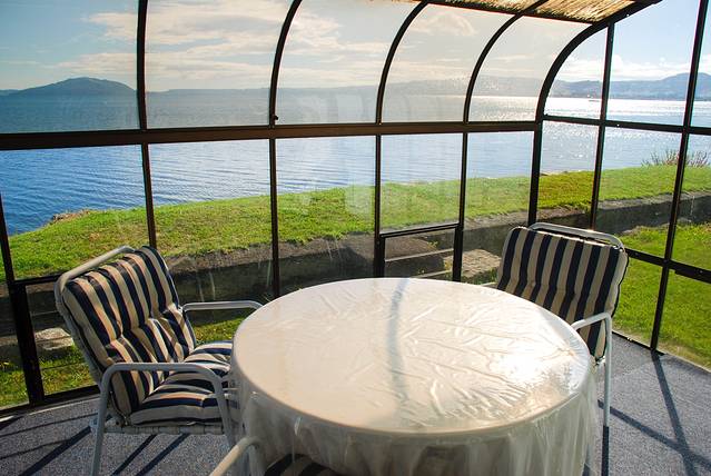 参观完萤火虫洞,又开了将近两个多小时,在下午5:30的时候正式看到了新西兰的第一个湖——罗托鲁瓦湖。开在公路上刚刚看到那大湖的时候感觉真的没话说!超级漂亮!只可惜因为当时赶去和holiday house的房主见面没有停下来照相。一进城真像攻略里说的,一股浓郁的臭鸡蛋味,当时的第一个想法就是,这里的温泉绝对不是热水,是实打实的地热!等我们到了holiday house更是吃惊。家里就有从地下打上来的温泉可以泡,根本不用去地狱之门啊!不愧是一座火山口上的城市!简单的只照了住家的阳光房,就在湖边。