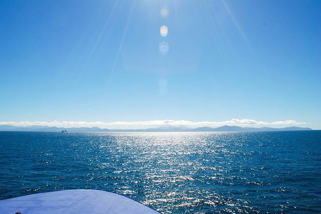 紧赶慢赶还是比check in时间晚了5分钟到了,本来以为会赶不上,结果发现大家也都是不紧不慢的排队等着把车开到船里。如果你仔细看,照片中那小小的大船就是轮渡的船。