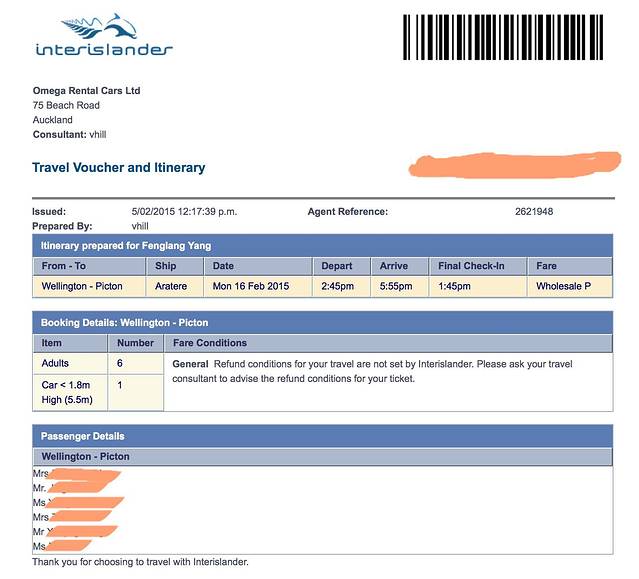 租车公司帮忙预定了下午2:45的轮渡船票,但是后来才发现check in时间整整提前了一个小时。但是行程已经定了,我们只得着急忙慌的从汤加里罗感到惠灵顿。Google上显示有289公里,但是请大家务必预留5个小时到六个小时的时间来走,因为没记错的话有一大段是山路不好开。下面是预定函。