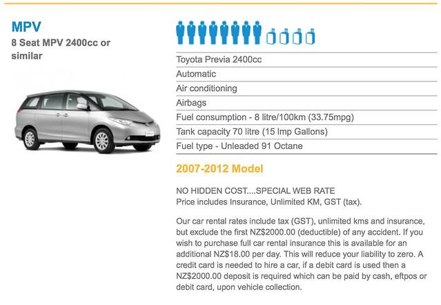 本来打算租房车自驾,结果因为我们定的太晚,加上房车的空余不是很多,所以比较下来还是租一辆小车比较合适。在决定租车公司的时候我们其实是很受限的,因为定的晚车辆不充裕。像apex,hertz都已经没有合适的车了,选来选去最后我们omega租了一辆丰田大霸王。总体来说公司算是新西兰比较大的,服务态度还不错,还车的时候很快没有过多的检查车辆直接收了,上面被我们开车时蹦的石头子印没有计较还不错!但是omega的车辆不是很新,车龄大概五年到两年。虽然上了全险但是很多人为的事故都是要自己负责的,其实说白了条款中有很多就是撇清关系的,当然这个也可以理解。