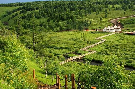 夏天的奥伦布坎气候凉爽,空气中饱含着负氧离子和花草的香气,不潮,不燥,不热,满眼都是一尘不染的绿色。一路高大的落叶松、白桦、樟松、山杨骄傲地伸展手臂。在林海涛声之中,还能欣赏到天河峡谷、火山地缝、空中花海等美景奇观。