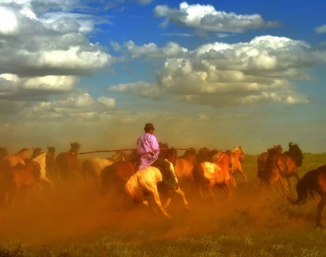 站在九曲十八弯的锡林河边,远远的腾起一片尘土,那是牧民在奔腾的马群中套马,狂野的骏马在阳光下,肌肉闪耀,鬃毛飞舞,刹那间寂静的草原变得生机勃勃。