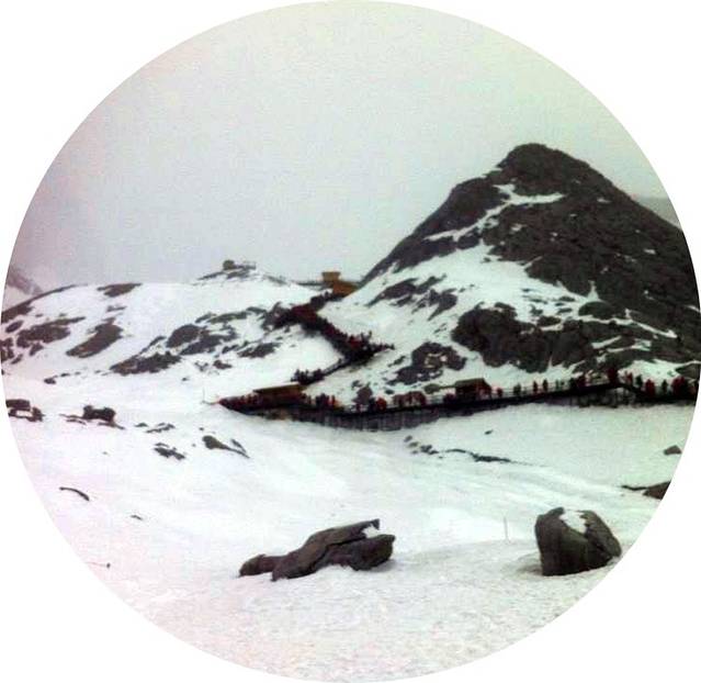 不过,今天身体不适,因为病了,成功登上雪山已是最大努力,为了帮助儿子实现愿望,算是值得。今天感受了一把什么叫龙的传人,进景区排长龙,等进候车厅1个小时,等上山大巴1个小时,下索道又等,再等。还是那句,早起的鸟儿有虫吃。