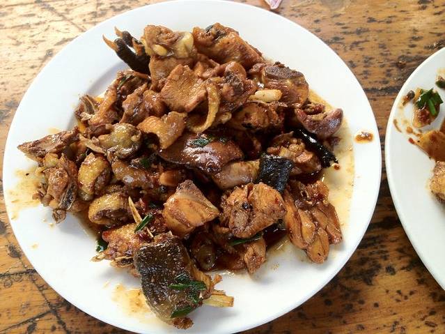 他们家的鸡是漫山放养的走鸡,看中哪只抓哪只。从杀机到上桌只要16分钟,曾被旅游卫视报道过三次呢。老板自荐说,他们家的党参炖鸡,更是一绝,但是需要提前一个半小时预订,所以,想一尝美味的亲们,可以自古城出发时,就打电话来预订,等爬上山,时间就正好了。老板姓杨,手机15887343469,13320556991.