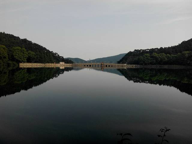 芦林湖,位于江西省九江市庐山区海拔1040米的东谷芦林盆地,故又称东湖。从黄龙寺沿石阶曲径上行约20分钟,便到芦林大桥。一路密林蔽日,树干高耸挺拔,夏日人行其间颇感凉爽。芦林大桥高30米,桥坝一体,拦水成湖,湖水如镜,似发光的碧玉镶嵌在林荫秀谷之中,在缥缈的云烟衬托下美丽。据说冬游芦林湖景色更为别致,进入冬季后芦林湖畔上的树木结成雾凇,成为了一到壮丽的风景,很多游客慕名而来。芦林湖四周群山环抱,苍松翠柏,景致优美。此处原是芦草丛生、野兽出没的芦林谷地,介于玉屏、星洲两峰之间。1954年在二峰间筑坝蓄水,次年建成。大坝高32米,长120米,宽12米,全湖面积约9万平方米,蓄水120万立方米。湖水洁净清澈,碧清如镜,山色倒影,相映成趣。湖心有两小亭,外观秀丽、精巧,为湖面增光添彩,内则分别用作汲水塔和溢洪道。芦林湖所蓄之水目前为庐山牯岭镇1.3万居民的主要水源。芦林桥建于芦林湖大坝坝面。大坝体积达3万立方米,系用石块和水泥混交筑成,雄伟宽坦。大桥桥身上段有5个桥孔,溢洪时,五孔喷流,似五条龙飞吼而下,成为壮丽的人工瀑布。此景可立于“蛟芦桥”上观得。交芦桥在坝旁峪谷涧底,由桥南踏石阶而下百余级即可到达。