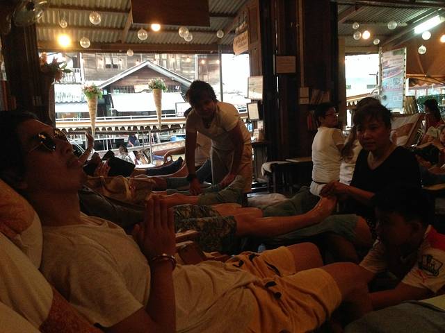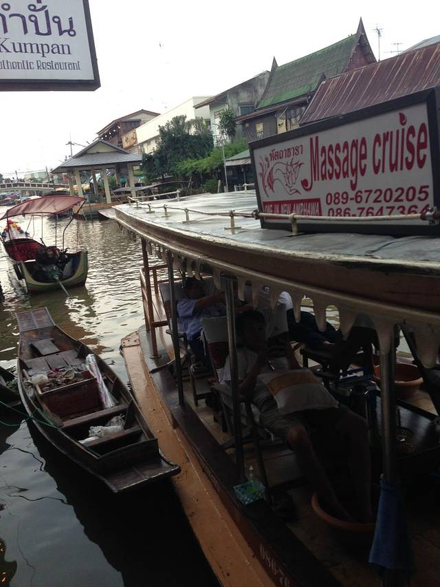 沿着河边一直逛,你会看到一家"马杀鸡游轮"。在小船上来个正宗的泰式按摩还可以游河!而且不贵!但是要提前订,哪怕就岸边的按摩都要排好长的队。一般在岸边足底按摩的话是150泰铢一个小时。