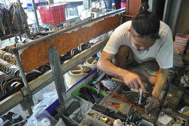 沿岸是各色泰国特色的商店,逛得停不下腿!这是一家订制皮具小首饰的店,有手链戒指项链,可以选择自己想要的皮料和字母进行现场加工。