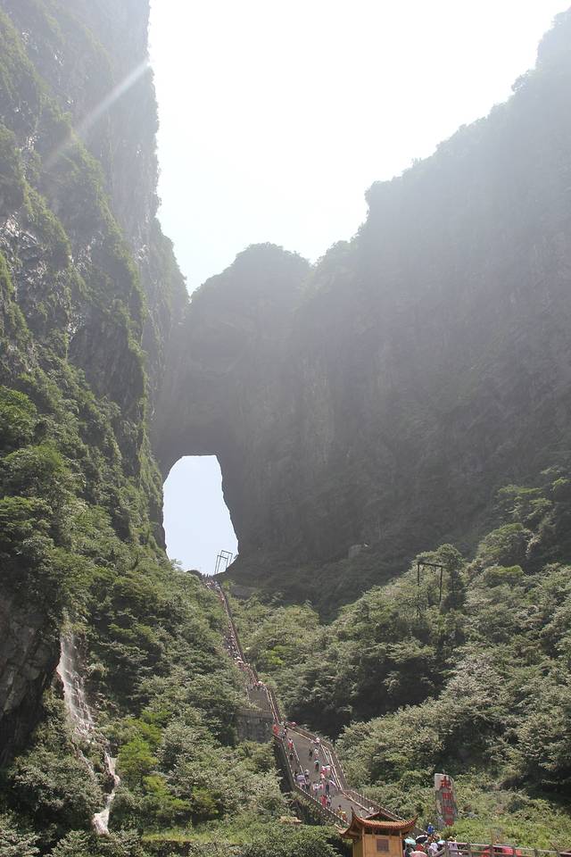 特别提醒大家的是,如果走东线,一定要所有山顶都游览完再坐扶梯下山,因为你持有的票只供单程坐扶梯,坐扶梯相当于从山顶下到半山腰(即天门洞),之后就不能再免费返回山顶了。所以我俩先走西线再走东线在这一点上更加合理了。山顶大概游览五个小时,我们自由行,不着急,一路看风景一路吹山风,俩人唠着嗑,一点不到游完了山顶,之后坐扶梯,扶梯全程7级,建在山体内部,非常阴凉。出扶梯步行几分钟即到达天门洞。天门洞真的很壮观,之前翼装飞行就顺利穿过了天门洞,很是牛叉啊。之后步行下999级台阶,排队坐巴士下山,体验通天大道!据说有99个弯!