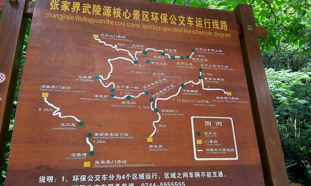 武陵源区特别大,光常见的售票处/入口就有三个(张家界国家森林公园售票处,武陵源标志门售票处,天子山售票处)。我通过去之前看到的诸多攻略和自己游玩之后总结一下,基本上景区有两条线,一是山上游线(包含袁家界、杨家界、天子山等),二是山下游线(包含黄石寨、金鞭溪、十里画廊等),一般山下游线安排一白天即可,山上游线需要2-3天。景区内部有免费环保车通行于各景点之间,沿路招手不停(我试过了),同时注意山上和山下是无法互通环保车的, 毕竟山上和山下存在一个高度差。